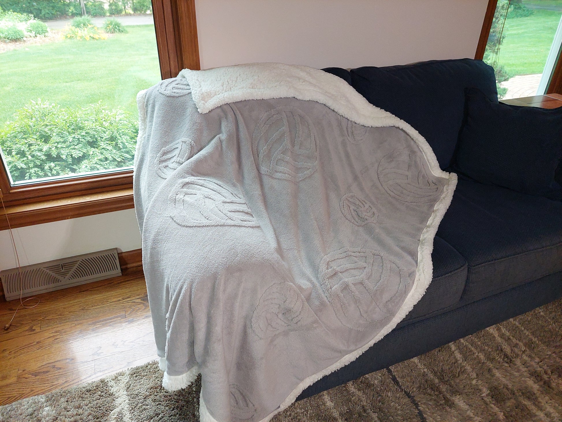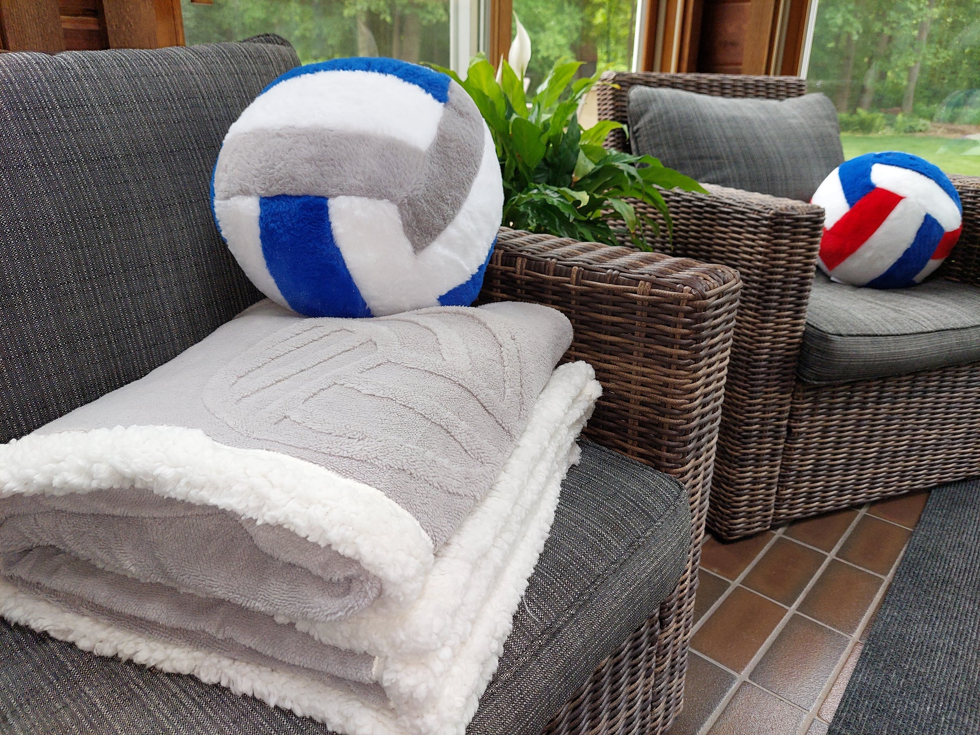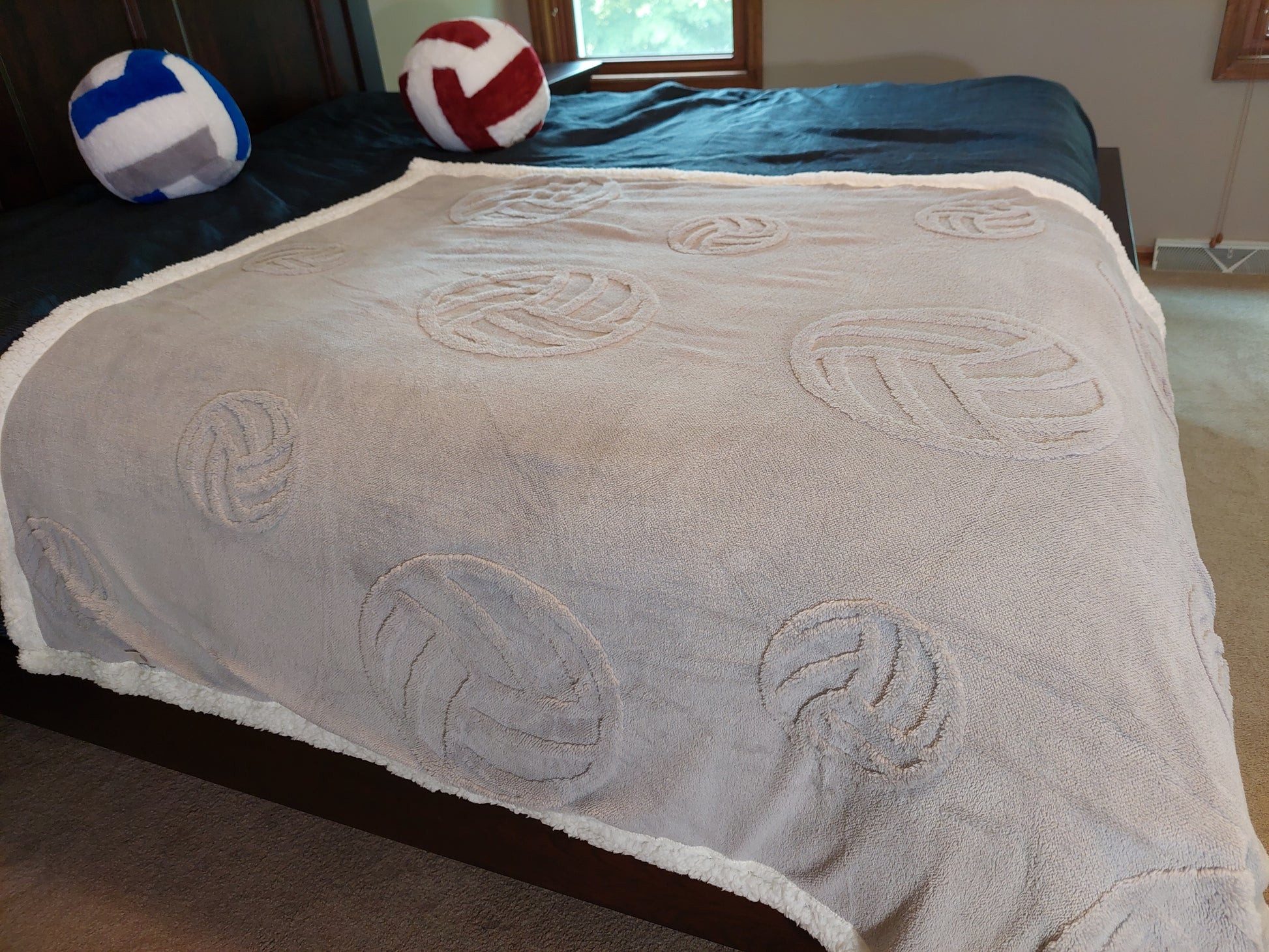Volleyball throw blanket, super soft premium quality faux fur material with 3-dimensional volleyball pattern woven right into the fabric. The back of the blanket is a soft sherpa material. Dimensions: 60" x 50"