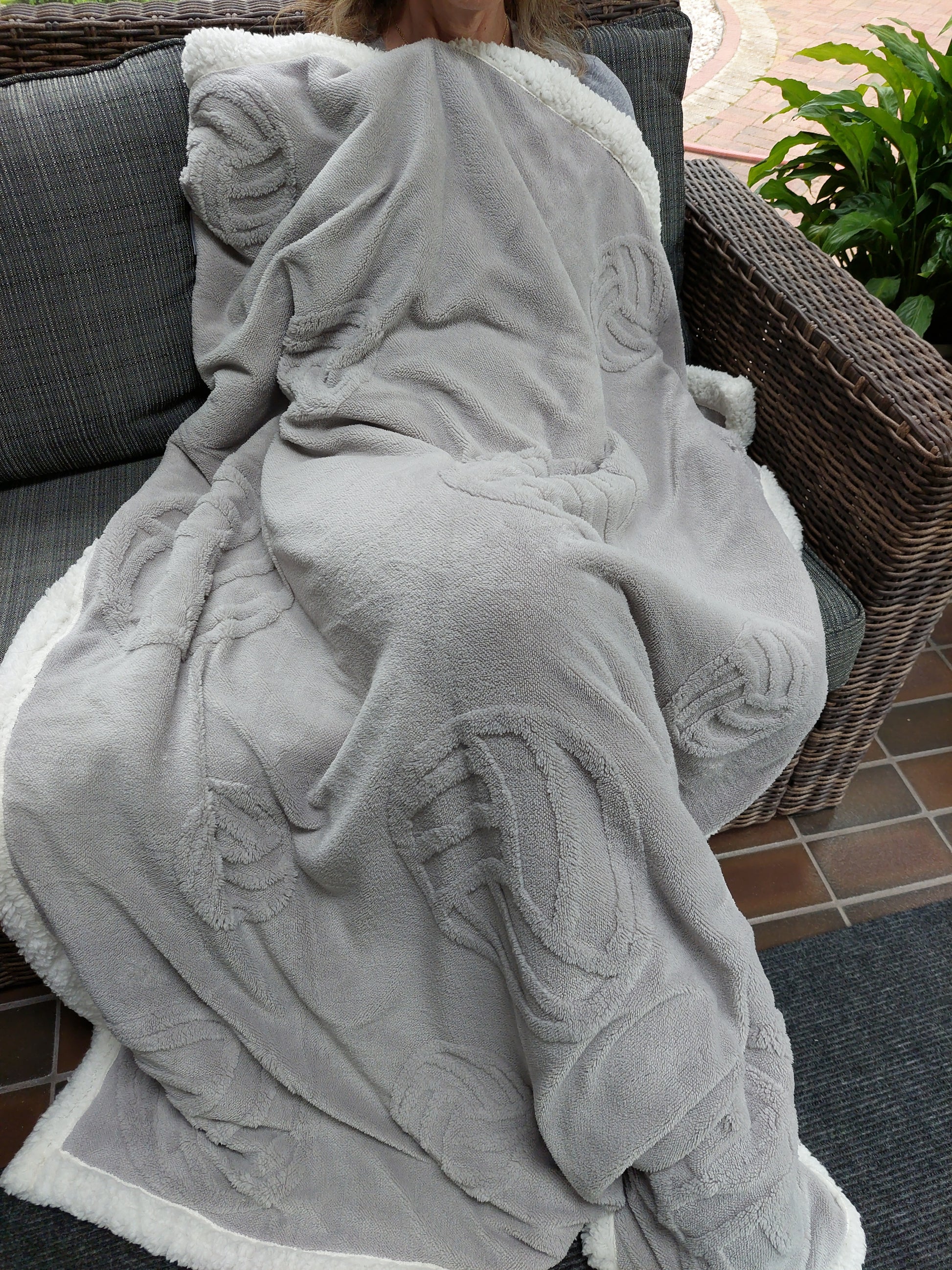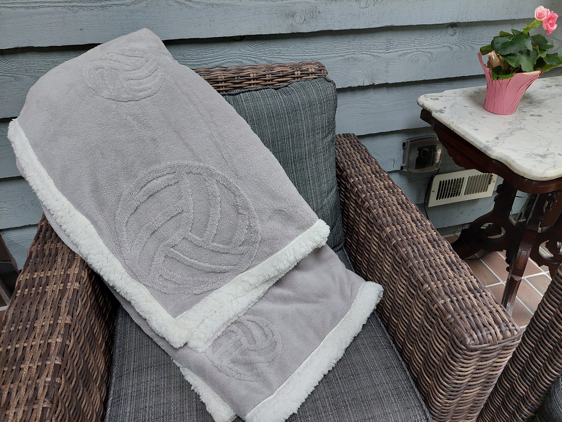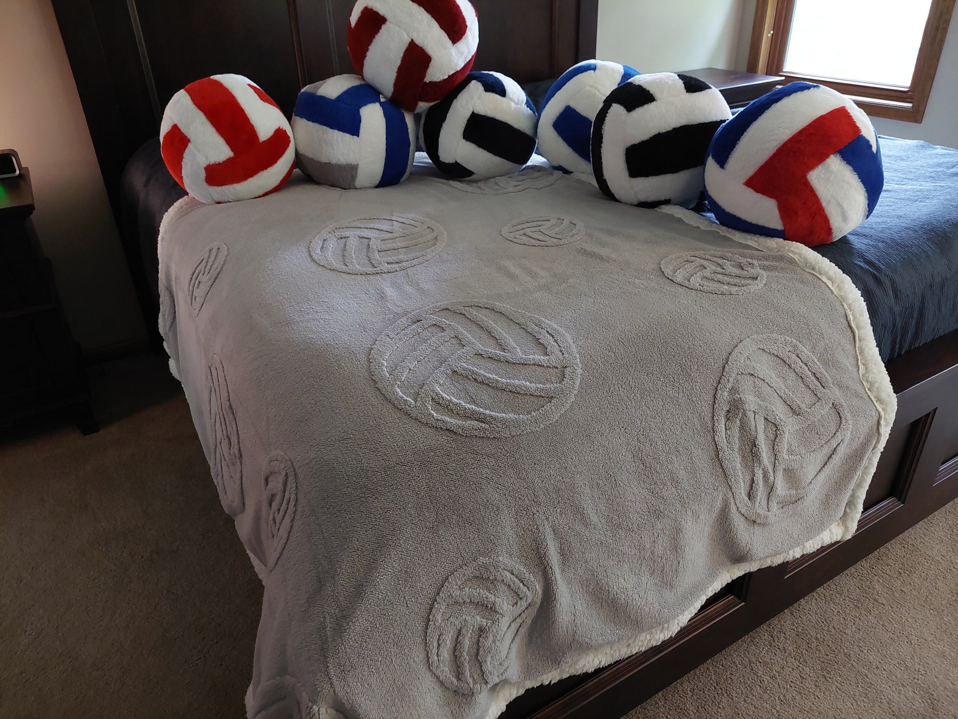 Volleyball throw blanket, super soft premium quality faux fur material with 3-dimensional volleyball pattern woven right into the fabric. The back of the blanket is a soft sherpa material. Dimensions: 60" x 50"